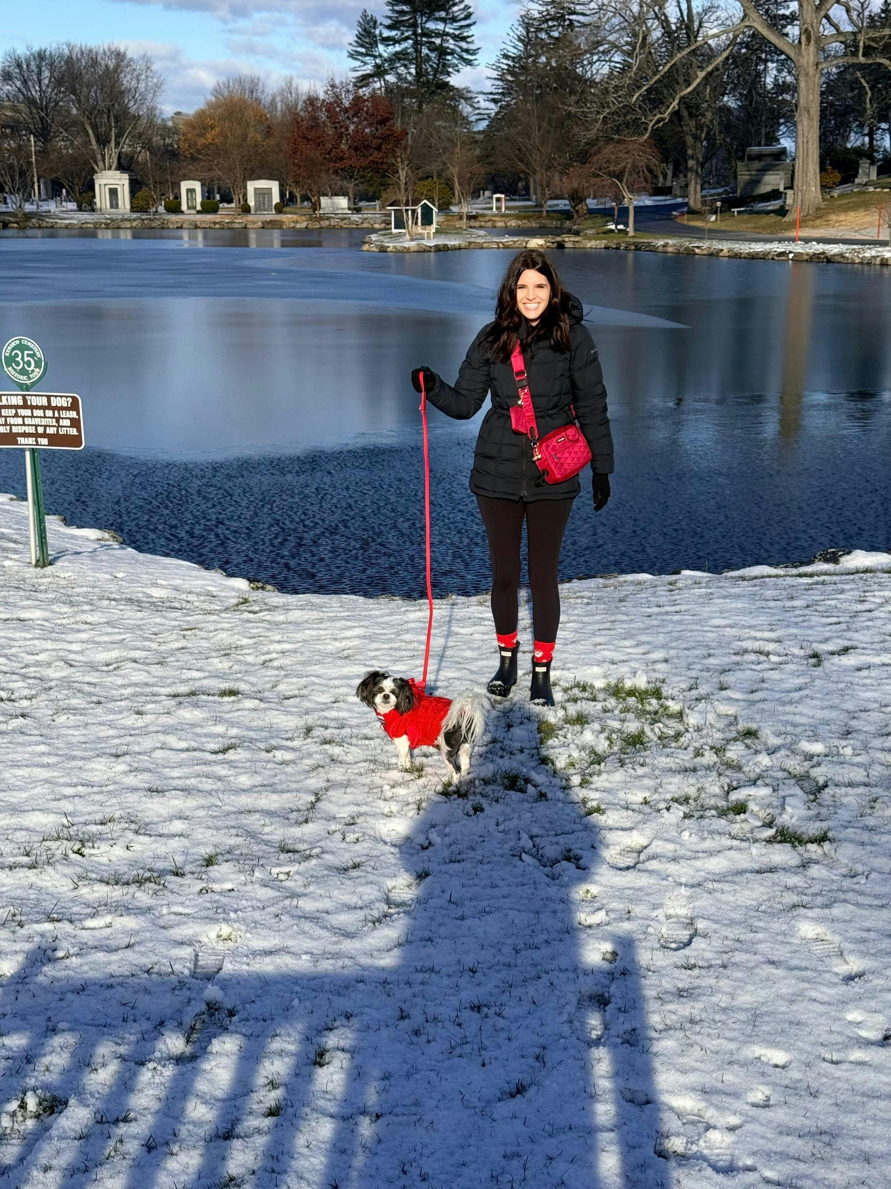 We love this bag! Super well made and so pretty. Fits all the essentials for walking your pup. So fun to match as well!