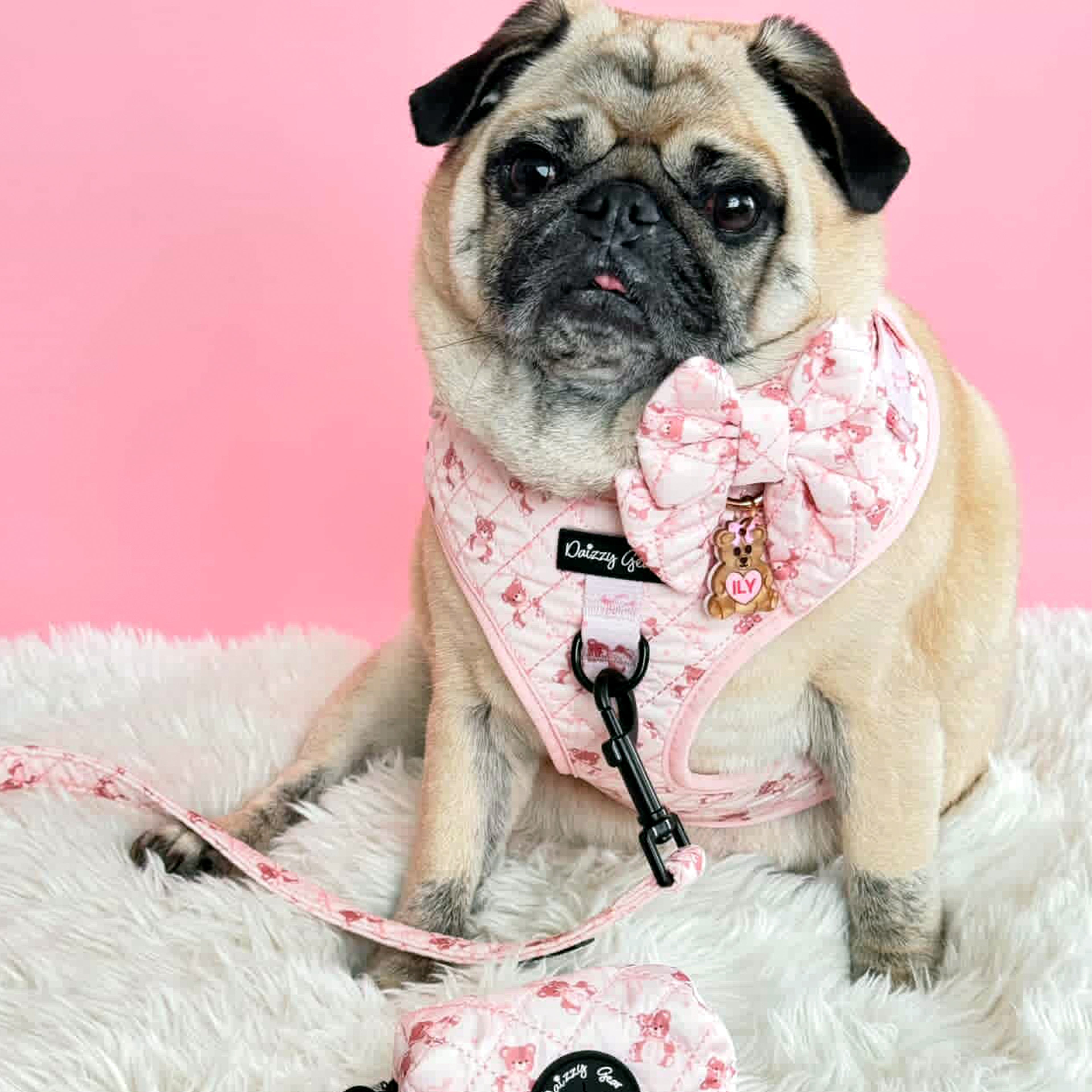 Hi all! Daizzy Gear has sent us the cutest red heart harness set. This set included, the harness, collar, leash, and poop bag holder (with bags inside!) The quality is great! It is also true to size. I ordered my french bulldog a medium. I would recommend this brand, and harness set! ❤️🐶