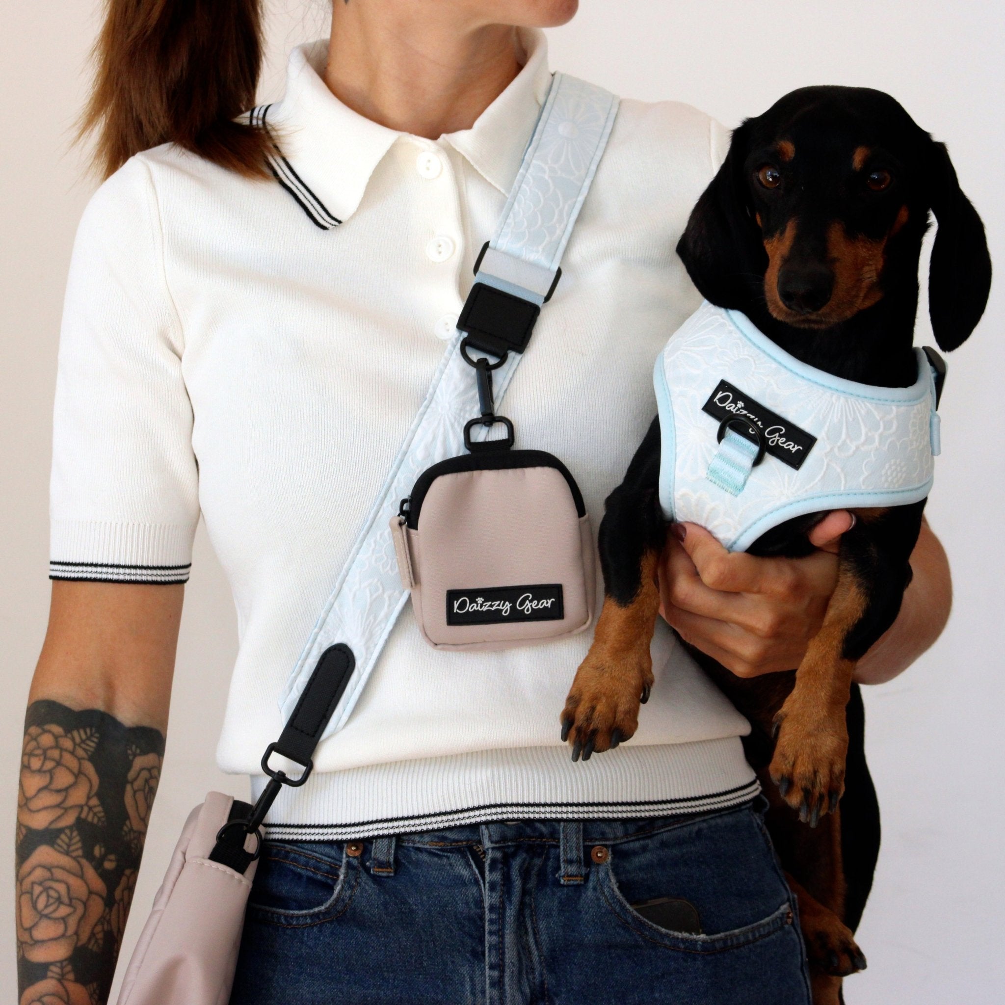 Meet the Divine Petals Blue Dog Mom Twinning Bundle with matching dog walking set and matching walking bag , created for stylish dog moms who love matching moments and organized walks. This coordinated bundle includes a no-pull harness, matching collar, secure leash, poop bag holder, and a dog walking bag with a detachable treat pouch. The soft blue floral quilted fabric brings a gentle and elegant feel to everyday outings, photos, café mornings, and travel adventures.