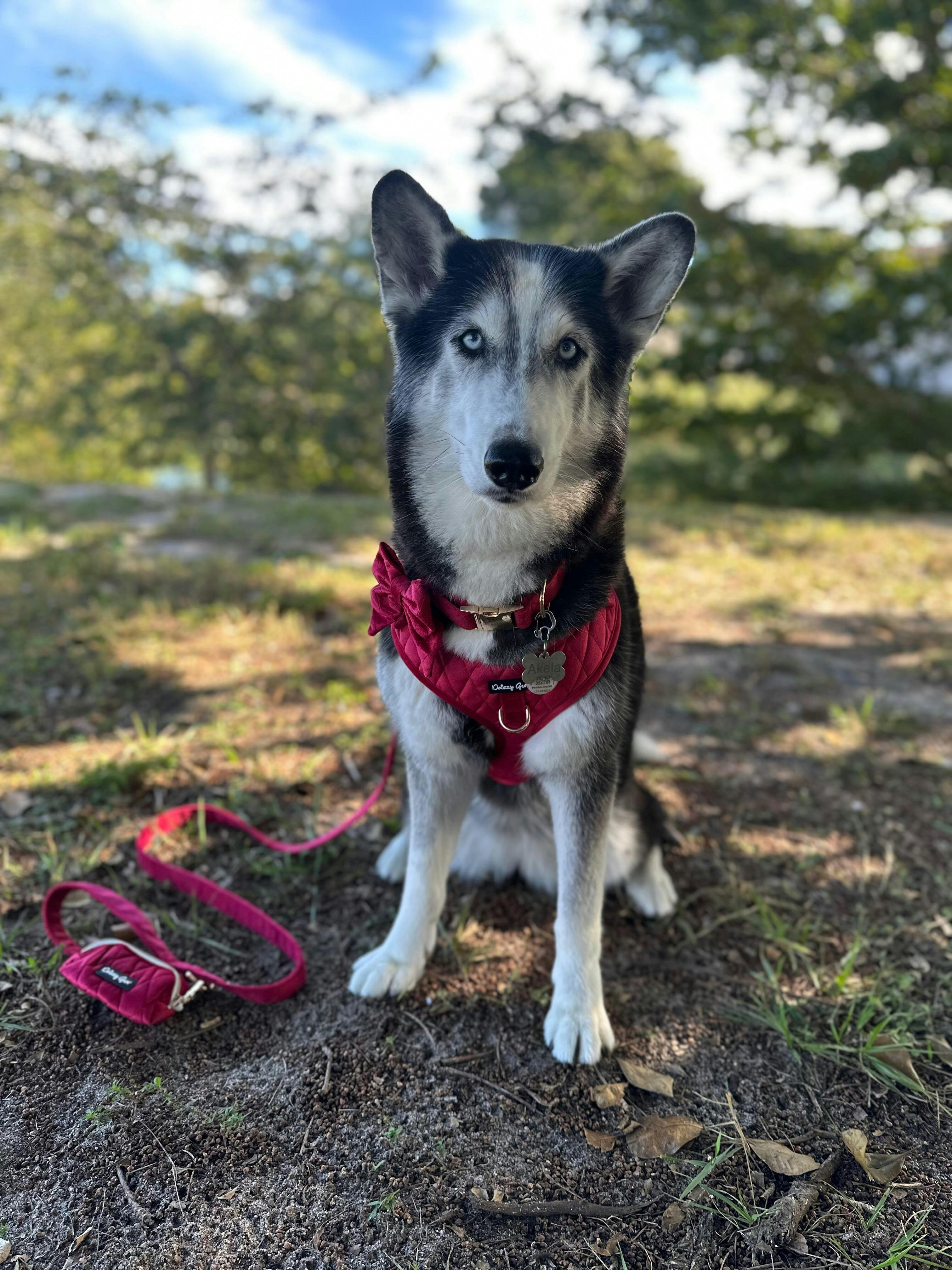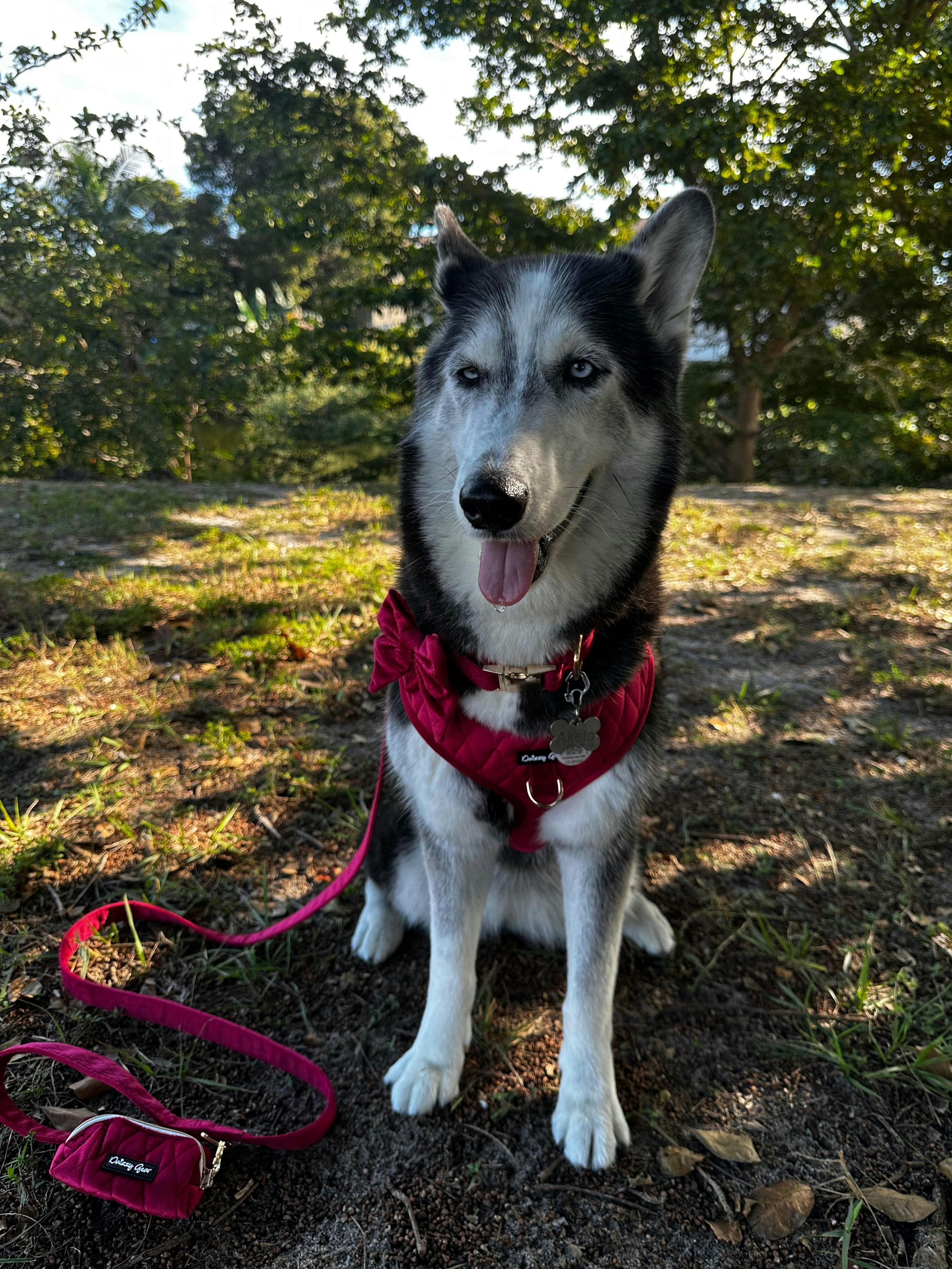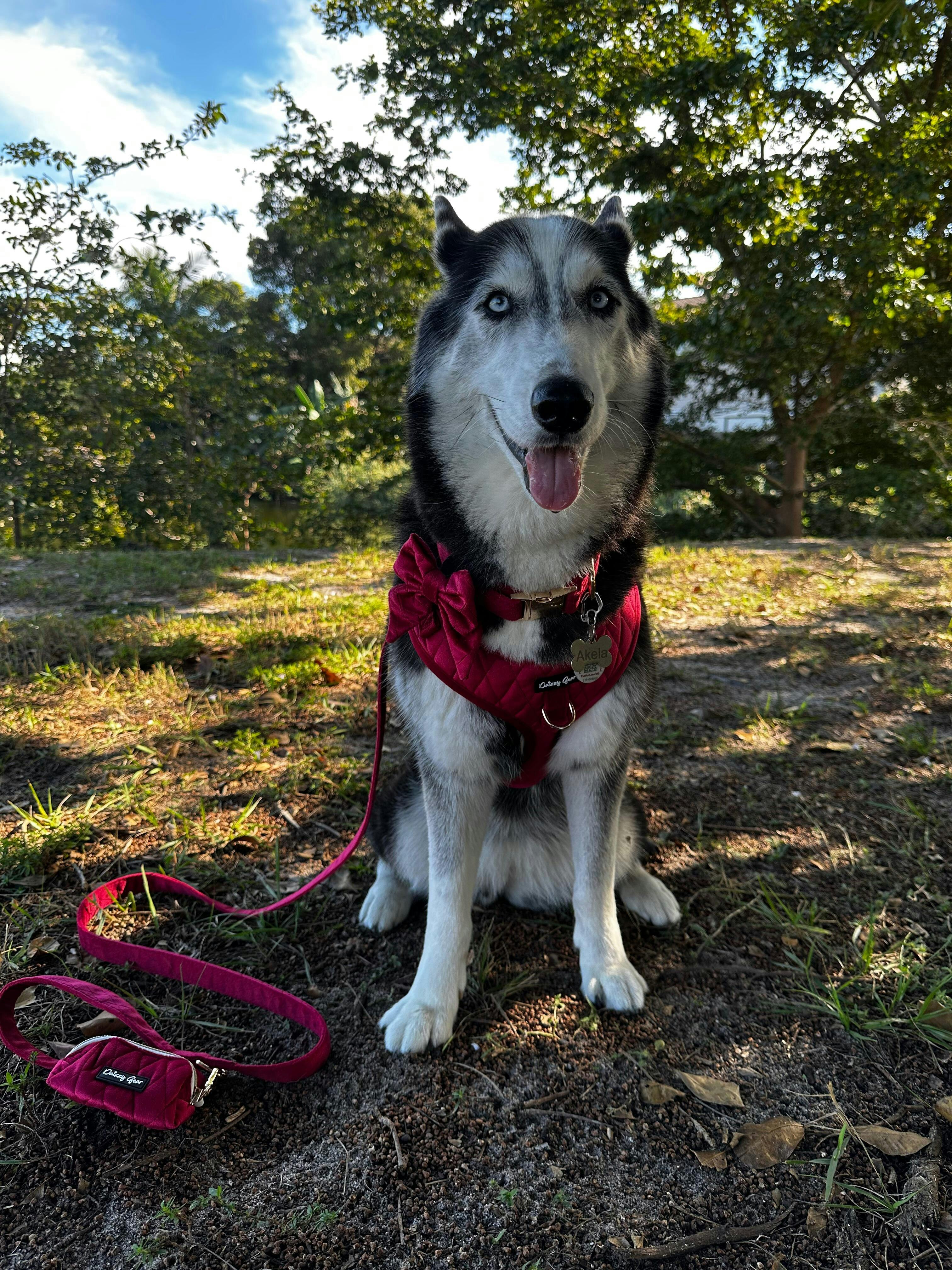 Meet the Pup Wishes Red Velvet Dog Walking Matching Harness Set (5-Piece), designed for stylish dog moms who love coordinated walks. This bundle includes a soft no-pull harness, matching collar, secure leash, quilted poop bag holder, elegant sailor bow, and a comfortable fit for everyday outings. The velvet-style quilted fabric is gentle on your dog’s fur while providing a warm and cozy feel during cooler seasons. The no-pull design supports gentle control by distributing pressure across the chest instead of the neck, making walks safer and more enjoyable.