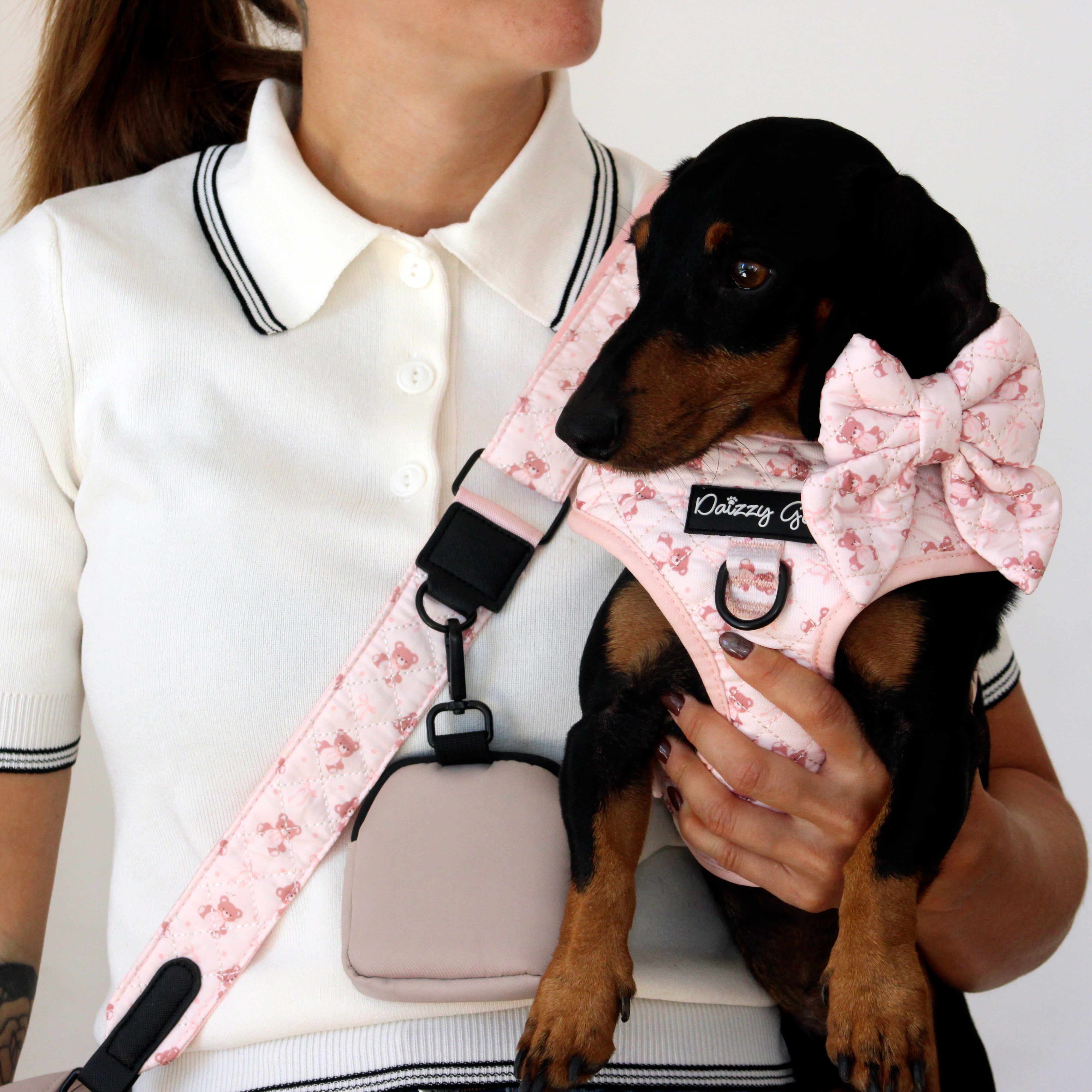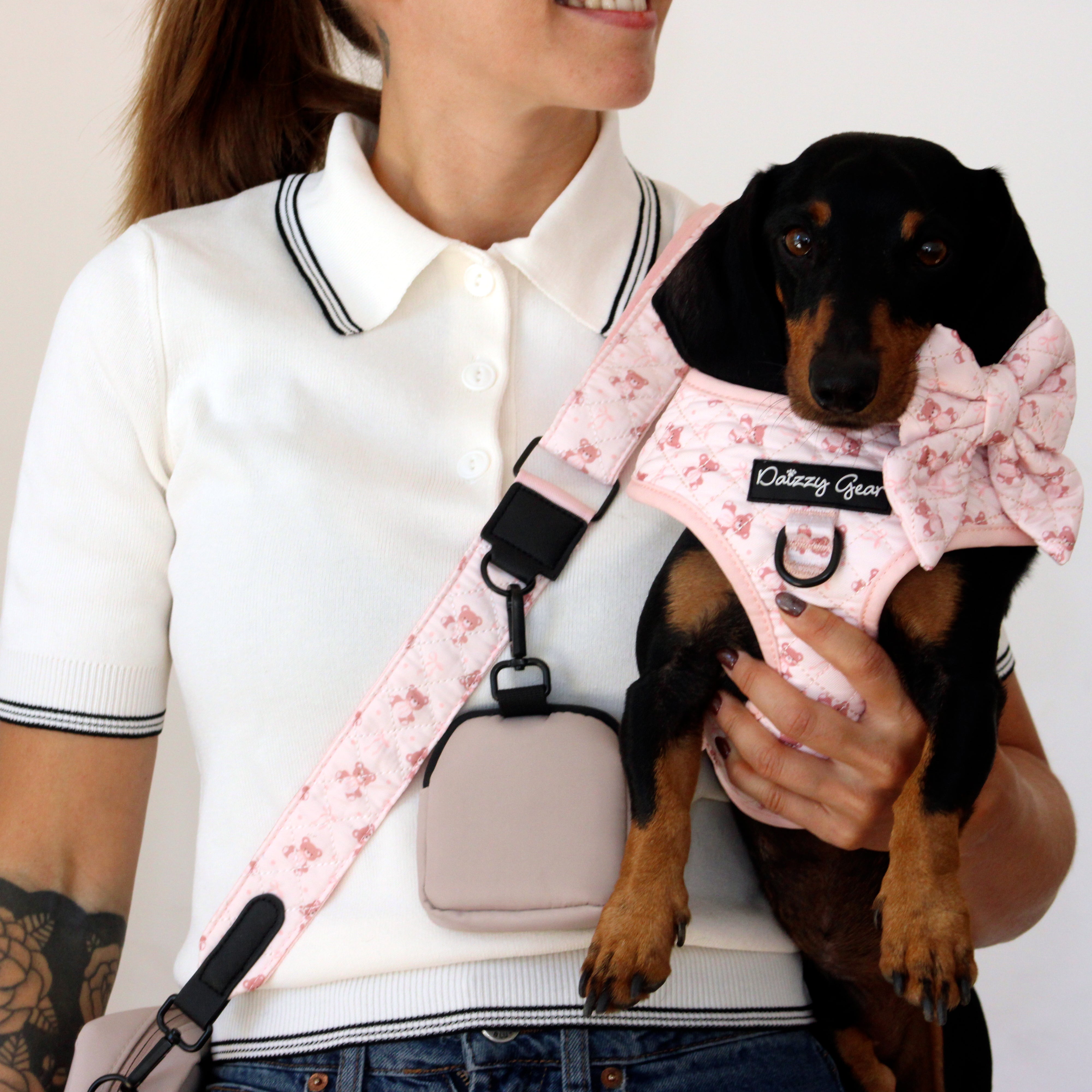 Elevate your dog walks with the Teddy Coquette Matching Bundle, designed for small dogs in style and comfort. This set features a soft, no-pull harness, adjustable collar, lightweight leash, and a cute sailor bow. It includes a waterproof poop bag holder and a stylish crossbody walking bag with a treat pouch and compartments for essentials. Enjoy convenience and charm every walk.
